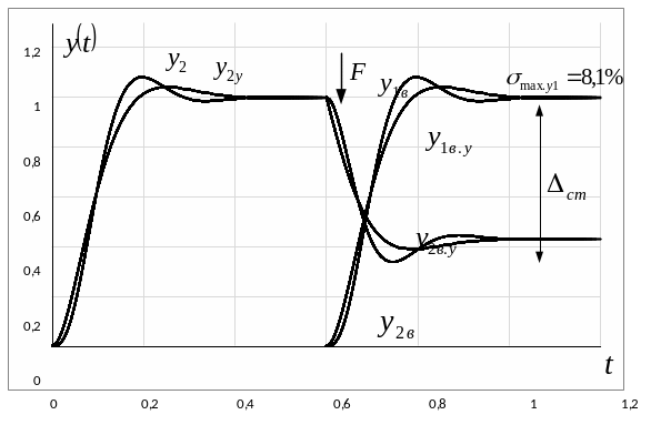По полученным кривым переходных процессов могут быть получены основные статические и динамические показатели статических САР при управляющем и возмущающем воздействиях: