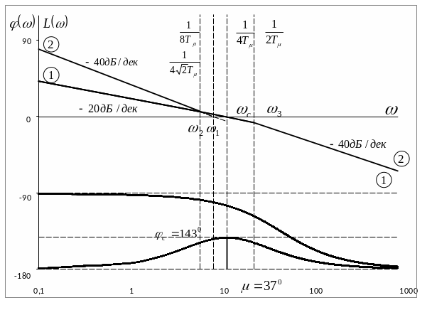 Рис. 18. ЛАЧХ и ЛФЧХ контура при настройке на симметричный оптимум