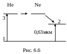 Электроны, образующиеся в разряде, при столкновениях возбуждают атомы гелия, которые переходят в возбуждённое состояние. При столкновении возбуждённых атомов гелия с атомами неона происходит возбуждение последних, и они переходят на один из верхних уровней неона, который расположен вблизи соответствующего уровня гелия (рис. 6.6). Переход атома неона с верхнего уровня 3 на один из уровней нестабильного состояния, а затем на уровень 1 приводит к лазерному излучению.