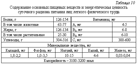 Цель: определить соответствие пищевого рациона студента основным принципам теории рационального сбалансированного питания. Задачи: - закрепление теоретических знаний по основным принципам рационального сбалансированного питания; - закрепление теоретических знаний по теории адекватного питания А.П. Уголева; - приобретение навыков по количественно-качественной оценке и коррекции пищевого рациона; - уточнить соответствие индивидуального питания основным положениям здорового питания (традиционные и нетрадиционные представления). Необходимы: меню-раскладка индивидуального питания, таблицы химического состава и калорийности пищевых продуктов; нормативы, рекомендуемые современной нутрициологией для студентов ФФК; калькулятор. Порядок выполнения задания: используя индивидуальные данные суточных энергозатрат и калорийности питания по меню-раскладке, а также данные суточного потребления белков, жиров, углеводов, витаминов, минеральных веществ, провести коррекцию их потребления в соответствии с рекомендуемыми нормативами с позиций ценности для индивидуального здоровья. Определить также сбалансированность основных нутриентов в рационе. Теоретическое обоснование задания. Учитывая ценность питания для здоровья человека, необходимо делать периодический анализ собственного питания для определения его количественной и качественной полноценности в соответствии с рекомендуемыми нормативами для студентов. В соответствии с классификацией трудоспособного населения по величине энергозатрат в сутки студенты ФФК относятся к группе лиц легкого физического труда, у которых среднесуточный энергорасход составляет приблизительно 43 ккал/кг массы тела (табл. 10). Следовательно, калорийность рациона должна составлять аналогичную цифру (предел колебаний в сутки не превышает 100 ккал). Содержание основных нутриентов регламентируется соотношением 1:1:4 для незанимающихся спортом и 1:0,7(0,8-0,9):4(5-6) для спортсменов, исходя из среднесуточной нормы белка 1,5-2,5 г/кг массы тела, в зависимости от величины мышечной нагрузки.