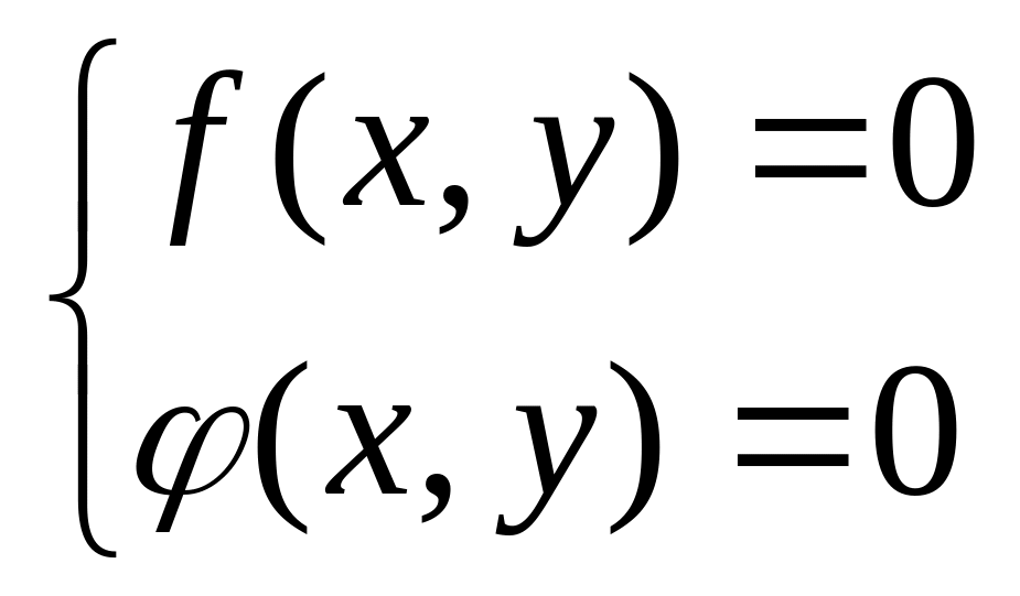 Отделение корней будет заключаться в приближенном определении точек пересечения 2-х кривых f(х,у), (х,у). Для этого уравнения f(x,y)=0 и (x,y)=0 представить в виде y=f*(x) и y=*(x) и построить графики. Точка пересечения определит корни уравнения.