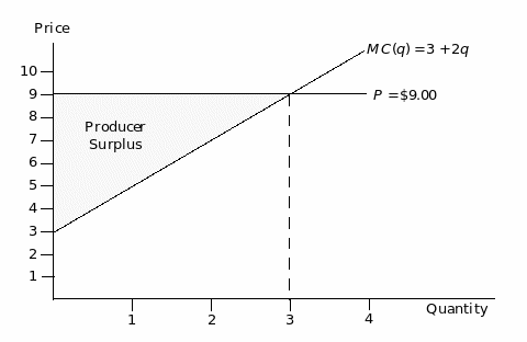 Producer surplus is equal to the area below the market price, i.e., $9.00, and above the marginal cost curve, i.e., 3 + 2q. Because MC is linear, producer surplus is a triangle with a base equal to $6 (9 - 3 = 6). The height of the triangle is 3, where P = MC. Therefore, producer surplus is