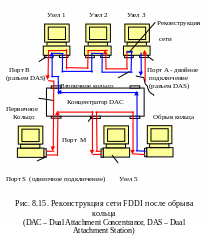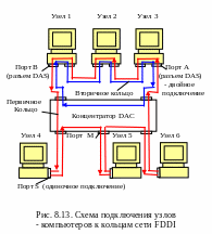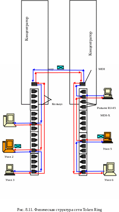 С целью более облегченного понимания архитектуры, на рисунке 8.11 представлена физическая структура сети Token Ring. Разделяемая между пользователями среда состоит из отрезков кабеля,