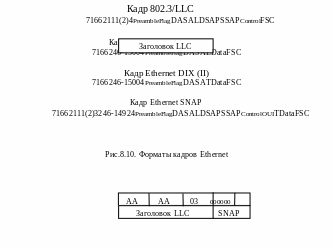 ты/коммутаторы и маршрутизаторы умеют работать со всеми форматами кадров технологии Ethernet, при этом распознавание типа кадра выполняется автоматически. На рис. 8.10 приведены форматы всех четырех типов кадров. В основу кадра 802.3/LLC положен формат, общий для всех архитектур (технологий) Ethernet, представленный на рисунке 8.10. Но, как было отмечено выше, в некоторых технологиях канальный уровень представляется двумя подуровнями: MAC и LLC. Подуровень (протокол) LLC – Logical Link Control, управляющий логической передачей данных, занимает промежуток между протоколами сетевого уровня и протоколами уровня MAC. Протокол LLC помещает пакет сетевого уровня в свой кадр, который дополняется необходимыми служебными полями. Итак, кадр LLC 802.3/LLC объединяет поля кадра уровней MAC и LLC. Поле преамбулы кадра включает семь байт вида 10101010 - для нужд синхронизации передачи, что на физическом уровне представляет собой манчестерский код с частотой 5 Мгц. Флаг 10101011 – определяет следующий за ним байт как первый байт заголовка. Адрес назначения (Destination Address, DA) может иметь признак индивидуального или группового адреса. Признак определяется значением первого бита старшего байта адреса. 0 определяет индивидуальный адрес, 1 – групповой – назначенный для всех, или выделенной централизованно группе пользователей.