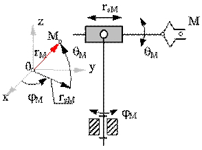 В результате матричных преобразований получаем радиус-вектор точки М схвата в функции обобщенных координат. Обычно, за обобщенные координаты принимают линейные и угловые перемещения в кинематических парах или на выходных валах приводов манипулятора. В механизме с n подвижностями в общем виде функцию положения схвата можно записать так