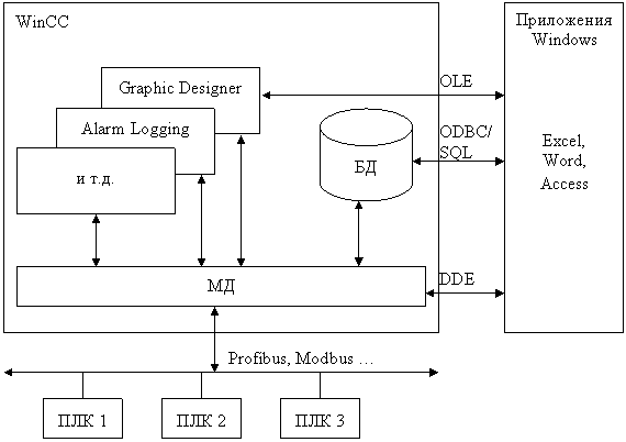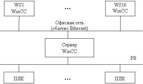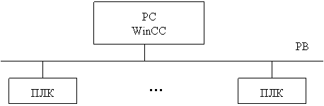 Программная часть SCADA-системы, состоящая из WinCC, и приложений Windows расположена на персональной ЭВМ, которая, с помощью специальной аппаратуры, подключается к одной из существующих полевых шин (Спец.аппаратура – плата расширения или внешний адаптер). Полевая шина предполагает подключение к ней группы ПЛК.