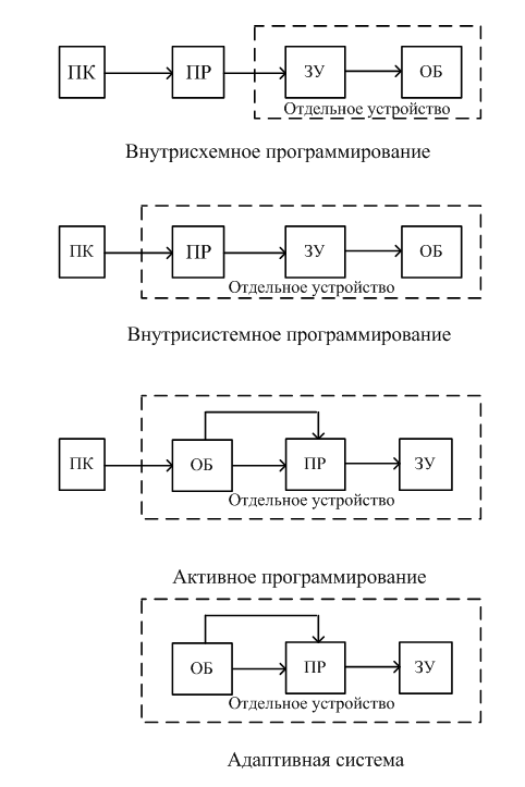 Отличие данного типа программирования в том, что внутри схемы позволяет записывать управляющую информацию в УУ уже смонтированное в виде модулей по специальному, предназначенному интерфейсу программирования.
