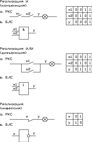 На рис.28 приведены реализации этих трех основных логических функций (конъюнкция, дизъюнкция и инверсия) как в виде релейно-контактных схем (РКС), так и в виде бесконтактных логических схем (БЛС).