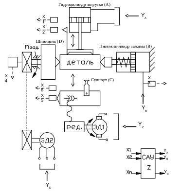 Приводы рабочих органов A, B, C, D станка можно перемещать в требуемой последовательности от механических кулачков, размещенных на вращающемся распределительном валу; по командам электромеханического командоаппарата, воздействующего своими упорами на кнопки управления; или от счетного электронного устройства (например на базе микро-ЭВМ), выдающего через определенные интервалы времени управляющие импульсы на соответствующие приводы. Перечисленные варианты управления относятся к централизованным системам автоматического управления (САУ) без обратной связи.