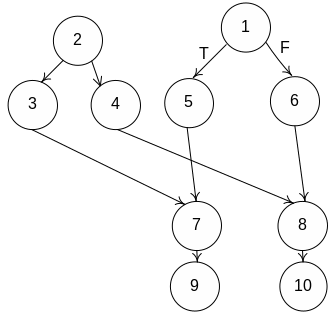 Более точное определение матрицы следования заключается в следующем: i –ой вершине графа G ставятся в соответствие i – ые столбец и строка матрицы, если существует связь по управлению , то элемент матрицы равен (i,j) = jT, порождает значение (i,j) = jF, при j → i образуется (i,j) = 1. Остальные элементы матрицы равны 0.