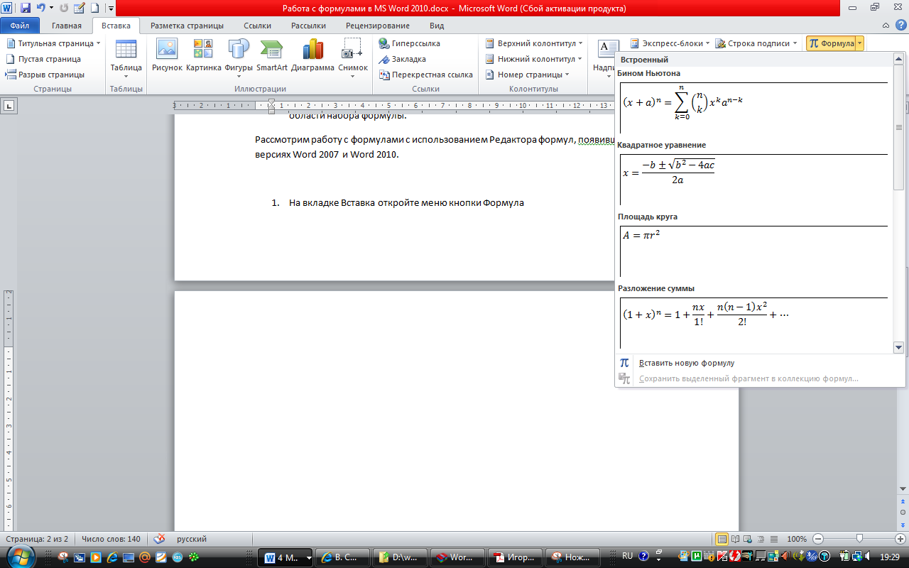 Рассмотрим работу с формулами с использованием Редактора формул (версии Word 2007 и Word 2010).