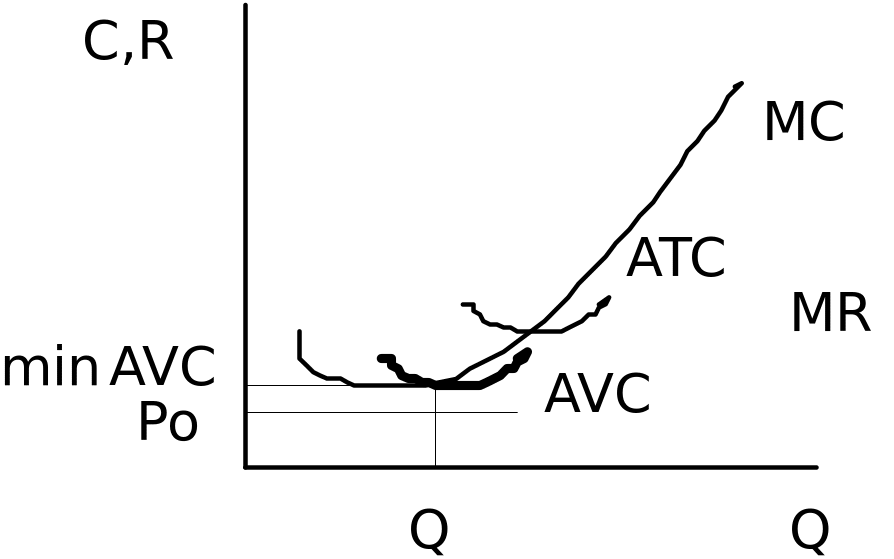 Поскольку Ро < min AVC (точки закрытия), то объем предложения фирмы равен нулю. Если рыночная цена повысится до более высокого уровня, то равновесный объем производства будет определяться соотношением MC = MR. Сама же точка кривой предложения (Q;P) будет лежать на кривой предельных издержек.