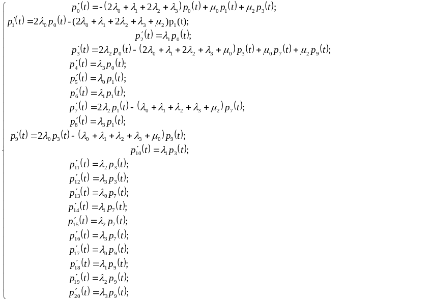 Для удобства записи уравнений пронумеруем узлы графа в естественном порядке. Тогда узлы (0), (1), (3), (7), (9) соответствуют исправным, а остальные узлы – отказовым состояниям. По графу составляется система обыкновенных дифференциальных уравнений, которая в данном случае имеет вид: