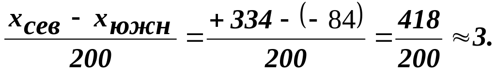Пример. Самая северная (имеющая наибольшее значение x) и самая южная (имеющая наименьшее значение x) точки имеют абсциссы xсев = +334,8 м ≈ +334 м; xюжн = -83,88 м ≈ -84 м.