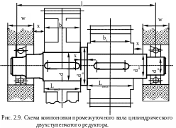 Расчет вала проводится на совместное действие изгиба и кручения, при этом определяется диаметр вала в опасном сечении. Для этого необходимо построить эпюры крутящего и изгибающего моментов. При построении эпюр необходимо знать расстояния между опорами вала (подшипниками), а также расстояния между находящимися на валу деталями (зубчатые колеса, шкивы, звездочки, муфты) и опорами. Для различных редукторов эти размеры определяются по-разному. На рисунках 2.8...2.12 изображены схемы компоновки валов различных редукторов.