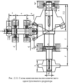 Для коническо-цилиндрического редуктора расстояние между опорами ведущего определяется как и для ведущего вала конического редуктора. Расстояние между опорами ведомого вала равно расстоянию между опорами промежуточного вала (см. рисунок 2.12) и определяется по формуле