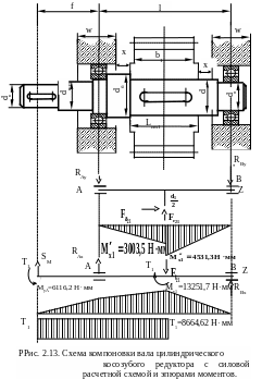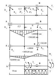 Рис. 2.17 Силовые расчетные схемы и эпюры моментов ведущего вала цилиндрического косозубого редуктора