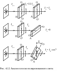 Если плоско поляризованный свет падает на анализатор А (рис. 4.13), то через него пройдет только составляющая, параллельная главной плоскости анализатора: