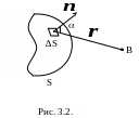 3. Каждый вторичный источник излучает преимущественно в направлении внешней нормали n к dS. Амплитуда вторичной волны в направлении r (где r – расстояние от dS до точки наблюдения В) уменьшается с увеличением угла α между r и нормалью n к dS (рис. 3.2). Она становится равной нулю при α ≥ π/2, т.е. излучение внутрь поверхности не распространяется. От каждого участка dS в точку В приходит световое колебание