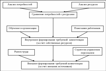 Управление компетенцией предполагает сравнение потребностей организации с наличными ресурсами и выбор форм воздействия для приведение их в соответствие. В данном случае под потребностью организации понимается необходимый количественный и качественный состав персонала, определяемый в соответствии с выбранной стратегией развития фирмы. Под человеческими ресурсами подразумеваются все работники организации с достигнутыми уровнями компетенции, желаниями, мотивациями, устремлениями. Результатом сравнения потребностей организации и ее человеческих ресурсов могут оказаться перестановки, передвижения, набор новых сотрудников, обучение и переобучение ряда своих работников.