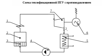 1 – пароперегреватель, 2 – паровой котел, 3 – экономайзер, 4 – питательный насос, 5 – теплофикационный теплообменник, 6 – электрогенератор,