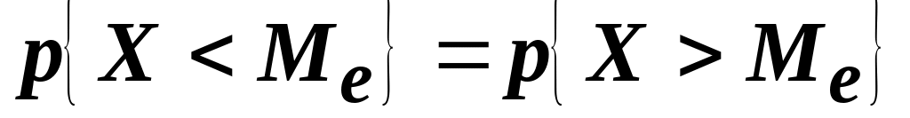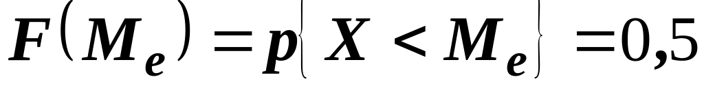 С геометрической точки зрения, медиана – абсцисса точки, в которой площадь, ограниченная кривой распределения, делится пополам. Так как вся площадь, ограниченная кривой распределения и осью абсцисс, равна единице, то функция распределения в точке, соответствующей медиане, равна 0,5: