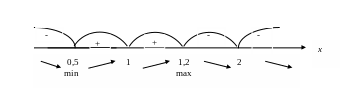 Соответственно точками экстремума являются точки с абсциссами х1 = 0,5 – минимум и х2 = 1,2 – максимум. Таким образом, уmin= f(0,5) = -2,5 и уmax=f(1,2) = -10.