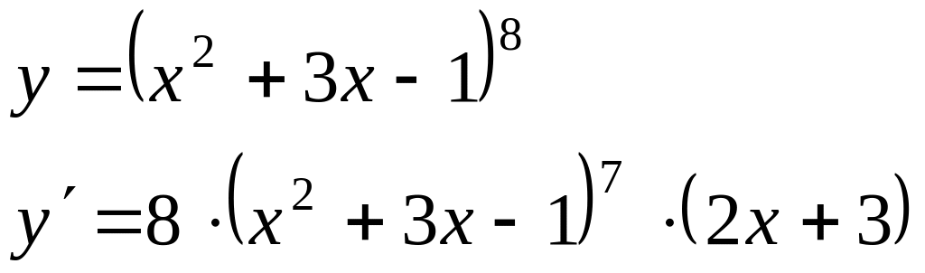 Замечание: Если в качестве переменной дифференцирования выступает у (переменная, которая является не аргументом, а функцией), необходимо вычислять производную согласно рассмотренным правила, обязательно умножая на у (на производную внутренней функции).