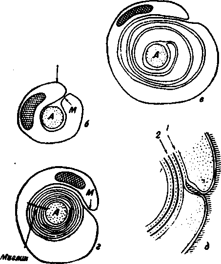Рис.5. Схема, иллюстрирующая образование миелиновой оболочки: б-аксон (А) окружен отдельной шванновской клеткой, М-мезаксон, в - спиральное закручивание мезаксона, г - образование компактной миелиновой оболочки, Д - схематическое изображение строения миелиновой оболочки: 1 - светлая промежуточная линия, 2 - главная плотная линия.