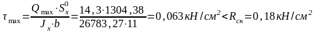 - •Запас прочности равен 83,2 %, т.Е стенка имеет значительный запас прочности на срез. Прочность принятого сечения балки в виде прокатного двутавра обеспечена.