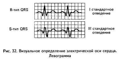 В этом случае отклонение электрической оси находят по анализу зубцов R и S в I и III стандартных отведениях. При этом понятие алгебраической суммы зубцов желудочкового комплекса заменяют понятием «определяющий зубец» комплекса QRS, визуально сопоставляя по абсолютной величине зубцы R и S .
