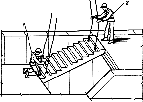 При установке лестничного марша монтажники находятся на верхней и нижней площадках. Основанием под опорные части марша служит слой раствора. На подготовленное основание опускают вначале нижний конец марша, а затем верхний. При одновременном опирании обоих концов элемента он может заклиниться, а при опирании вначале верхнего конца он может соскочить с зуба площадки. В обоих случаях возможна авария.