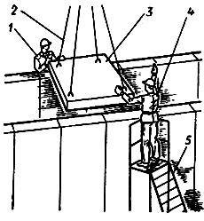 1 - рабочий, выполняющий монтажные работы, 2 - лестница на верхний этаж, 3 - строп, 4 - рабочий, выполняющий монтажные работы, старший в звене, 5 - площадка.