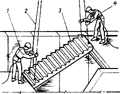 1 - рабочий, выполняющий монтажные работы, 2 - четырехветвевой строп с двумя укороченными ветвями, 3 - устанавливаемый лестничный марш, 4 - рабочий, выполняющий монтажные работы, старший в звене.