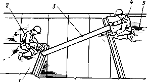 1, 5 - монтажный лом, 2 - рабочий, выполняющий монтажные работы, 3 - лестничный марш, 4 - рабочий, выполняющий монтажные работы, старший в звене.