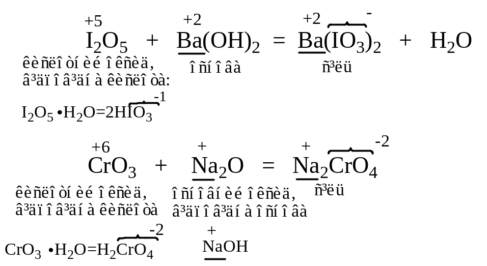 Оксиди беруть участь в реакціях кислотно-основної взаємодії, внаслідок яких утворюються солі. Сіль складається з залишків основи та кислотних залишків. В наведених нижче рівняннях реакцій залишки основи позначені рискою, а кислотні залишки – фігурною дужкою.