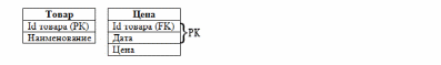 Даже не прибегая к 3НФ видно, что такая таблица будет содержать избыточную информацию. Но посмотрим на ее поля: поля Наименование и Дата зависят от id товара, а поле Цена зависит также и от Даты. Т.е. таблица не находится в 3НФ. Для устранения транзитивной зависимости необходимо провести "расщепление" объекта на два:
