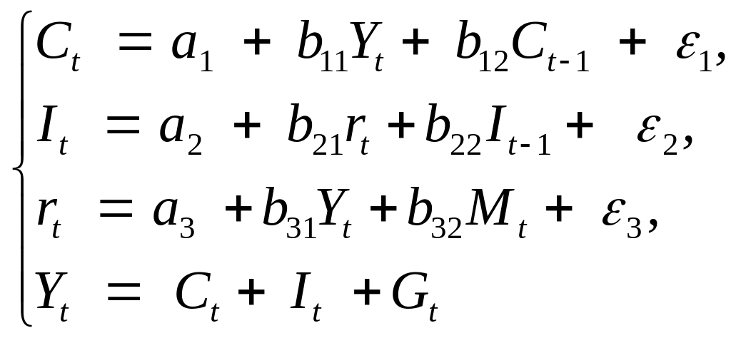 Где: Ct – расходы на потребление в период t, Ct-1 – расходы на потребление в период t-1, Yt – ВВП в период t, It – инвестиции в период t, It-1 – инвестиции в период t-1, rt – процентная ставка в период t, Gt – государственные расходы в период t, Mt – денежная масса в период t-1. |
