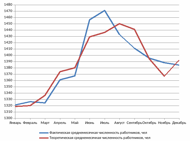 Отклонение фактической численности работников от теоретической численности наблюдается в каждом месяце, для наглядности отразим эти результаты на графике.