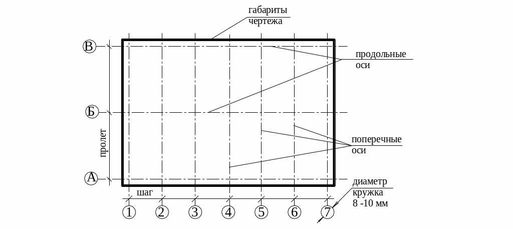 Проекции переносят тонкими линиями: вначале наносят модульные разбивочные оси. Разбивочные оси наносят тонкими штрих-пункти-рными линиями с длинными штрихами и маркируют арабскими цифрами и прописными буквами русского алфавита (за исключением букв З, Й, О, Х, Ь, Ы, Ъ), заключенными в кружок диаметром 8–10 мм. Цифрами маркируют оси по стороне здания с большим количеством разбивочных осей. Последовательность маркировки осей – слева направо и снизу вверх. Маркировку осей располагают на нижней и левой сторонах плана здания (рисунок 4), в исключительных случаях – справа и сверху.