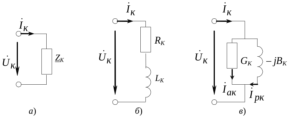 Реальную индуктивную катушку можно представить в виде схемы замещения последовательно включенных активного и индуктивного сопротивлений или параллельно включенных сопротивлений, величину которых удобнее характеризовать проводимостями: активной – Gк, индуктивной – Вк (рис. 1 а, б, в).