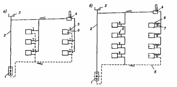 а — двухтрубная; б — однотрубная; 1 — хотел; 2 — главный стояк;