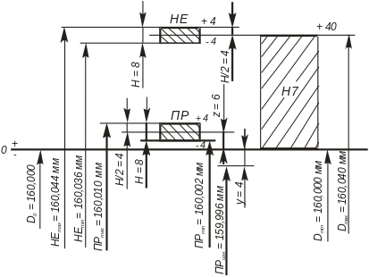 В соответствии с выбранной схемой расположения полей допусков калибров для контроля отверстия Ø160Н7 определяем числовые значения параметров H, Z, Y (таблица 2 ГОСТ 24853).