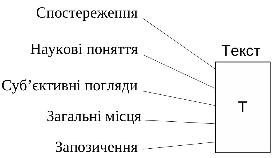 Розглянемо детальніше, які джерела живлять модель М1 і створюють текст Т. У роботі [34] вказані два компоненти будь-якого наукового тексту. Це перший матеріал спостережень та система наукових понять β в момент створення тексту. На додаток до цього, на наш погляд, крім об’єктивних даних експериментів та спостережень, в тексті обов’язково є суб’єктивні погляди автора , як результат його особистого досвіду, а також деякі „загальні місця” або „вода” . Крім цього, будь-який науковий текст містить запозичення з інших джерел (статей, монографій) і т.ін., при цьому всі компоненти занурені в мовне середовище L. Можна записати: