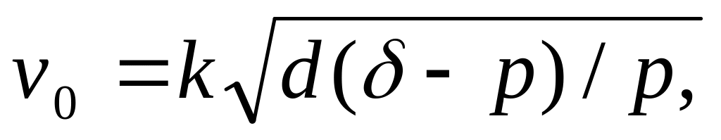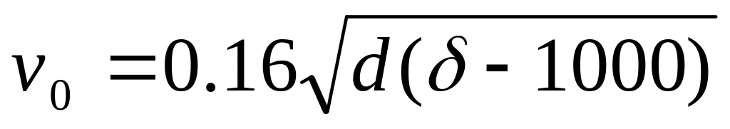 Сила опору підвищується зі збільшенням швидкості падіння частинок. У свою чергу, швидкість падіння тіла змінюється від нуля до v0, яку називають кінцевою швидкістю. Ця швидкість настає в момент, коли вага падаючого тіла дорівнює силі опору. Щоб визначити швидкість и0 для частинок розміром понад 1,5 мм, ураховують тільки динамічний опір середовища. Тоді, прирівнявши F0 i Fд (див. формули (3.49) і (3.50)), знайдемо кінцеву швидкість v0, м/с, падіння тіла в рідині: