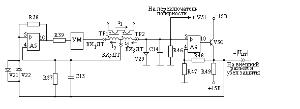 Большая часть высокочастотной составляющей тока протекает по цепи: вторичная обмотка ТР1, резистор R37, эмиттер V30, так как индуктивное сопротивление вторичной отмотки ТР2 велико. Конденсатор С13 обеспечивает режим устойчивой автогенерации. Низкочастотная составляющая тока, пропорциональная ампер-виткам первичной обмотки, протекая по цепи: вторичные обмотки ТР1 и ТР2, резистор R46, - создает падение напряжения на R46 отрицательной полярности, пропорциональное измеряемому току. Конденсатор С14 производит дополнительную фильтрацию низкочастотной составляющей тока. Напряжение с R46 поступает на переключатель полярности для формирования разнополярного сигнала Uдт для регулятора тока и на повторитель А6, который управляет транзистором V30. Отрицательный модуль напряжения датчика тока Uдт снимается с резистора R49.