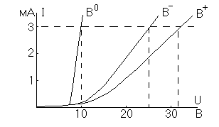 Магнитодиоды представляют собой диоды с несимметричным p-n переходом, в котором под действием магнитного поля увеличивается прямое сопротивление перехода и при заданном токе увеличивается падение напряжения на p-n переходе. Чувствительность выпускаемых магнитодиодов Sм.д (вольт/тесла) представлена в приложении (табл.30.20) /27, 61/. Магнитодиоды, чувствительные к направлению магнитного поля (планарные), выпускаются серийно типа ДК303А - ДК303Ж и КД304А1-1 - КД304Ж1-1. Их вольтамперные характеристики для В=0 и В+ практически не отличаются от характеристик магнитодиодов серии КД301А - КД301Ж. Характеристика для В- идет значительло левее характеристики В+, рис.20.3.