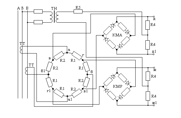 Схема содержит два ТТ, измеряющих токи в двух фазах, и трансформатор напряжения, измеряющий напряжение между теми фазами, в которых измеряется ток. Вторичные обмотки трансформаторов подключены к симметричному восьмиполюснику, составленному из четырех пар резисторов R1, R2. Трансформаторы тока включены в две противоположные диагонали. От двух других диагоналей напряжение поступает на входные диагонали кольцевых демодуляторов КМА и КМР. С выхода КМА снимается напряжение, пропорциональное Icos, а с выхода КМР снимается напряжение, пропорциональное Isin.