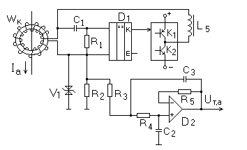 Обмотка трансформатора, с изменяющейся индуктивностью Lк, и конденсатор C1 создают колебательный контур. При открытии транзистора К1 или К2 ток в катушке под действием приложенного напряжения нарастает. При достижении насыщения кольца дифференцирующая цепочка C1- R1 вызовет переключение D1. Полярность приложенного напряжения меняется и начинается перемагничивание сердечника ТТ. При достижении насыщения вновь произойдет переключение D1. Частота переключений составляет 30 кГц. Постоянная составляющая тока Iк в обмотке wк пропорциональна измеряемому току фазы Ia. Сигнал, прорпорциональный измеряемому току, с наложенными на него высокочастотными колебаниями снимается с R2 и подается на вход операционного усилителя D2, который формирует синусоидальный выходной сигнал Uт.a , полностью подавляя высокочастотные пульсации.