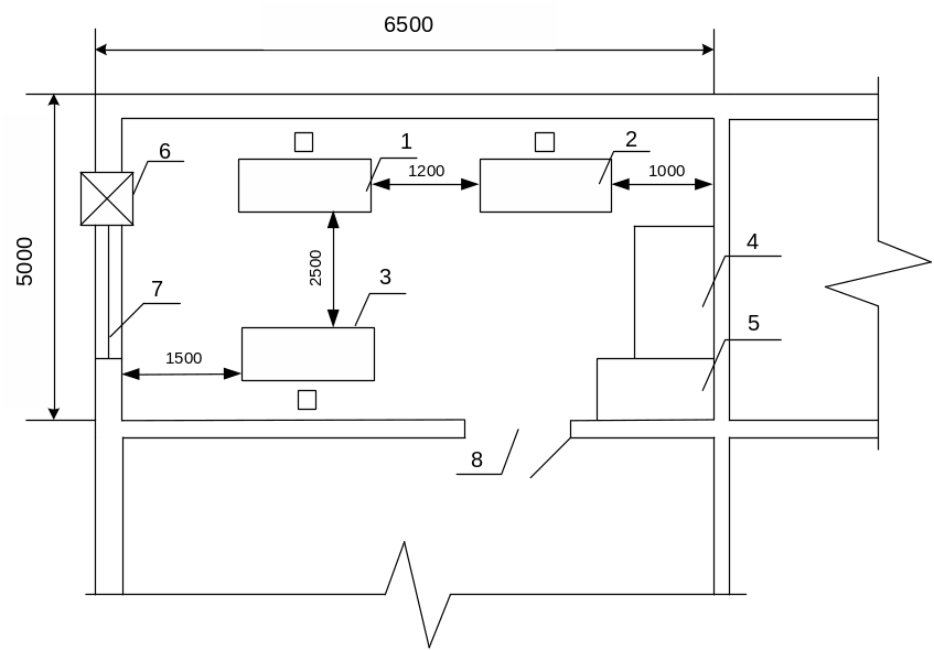 1,2,3 – робочі місця економістів; 4 – шафа для одягу; 5 – шафа для паперів; 6 – кондиціонер; 7 – віконний проріз; 8 – дверний проріз.